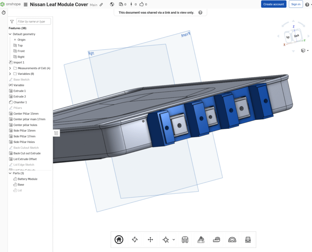 Credit: Note that I was not responsible for the design of the Nissan module in Onshape – I found this design in the Public Onshape repository and imported it into Onshape. This made it a lot easier to design my pieces.